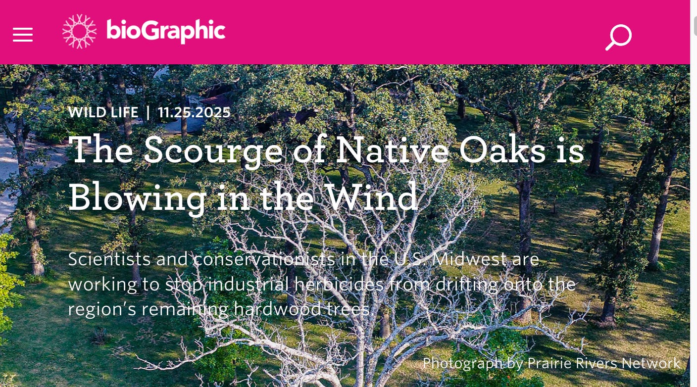 The story I’m probably most proud of this year was a longform, narrative feature for bioGraphic about a problem close to my heart (and to me geographically)—herbicide drift from crop fields killing oak trees in the Midwest. It was a lot of fun to get out into the field to report, to work with Krista Langlois, the magazine’s fantastic features editor, again, and to get this piece out there (which took most of the year!).