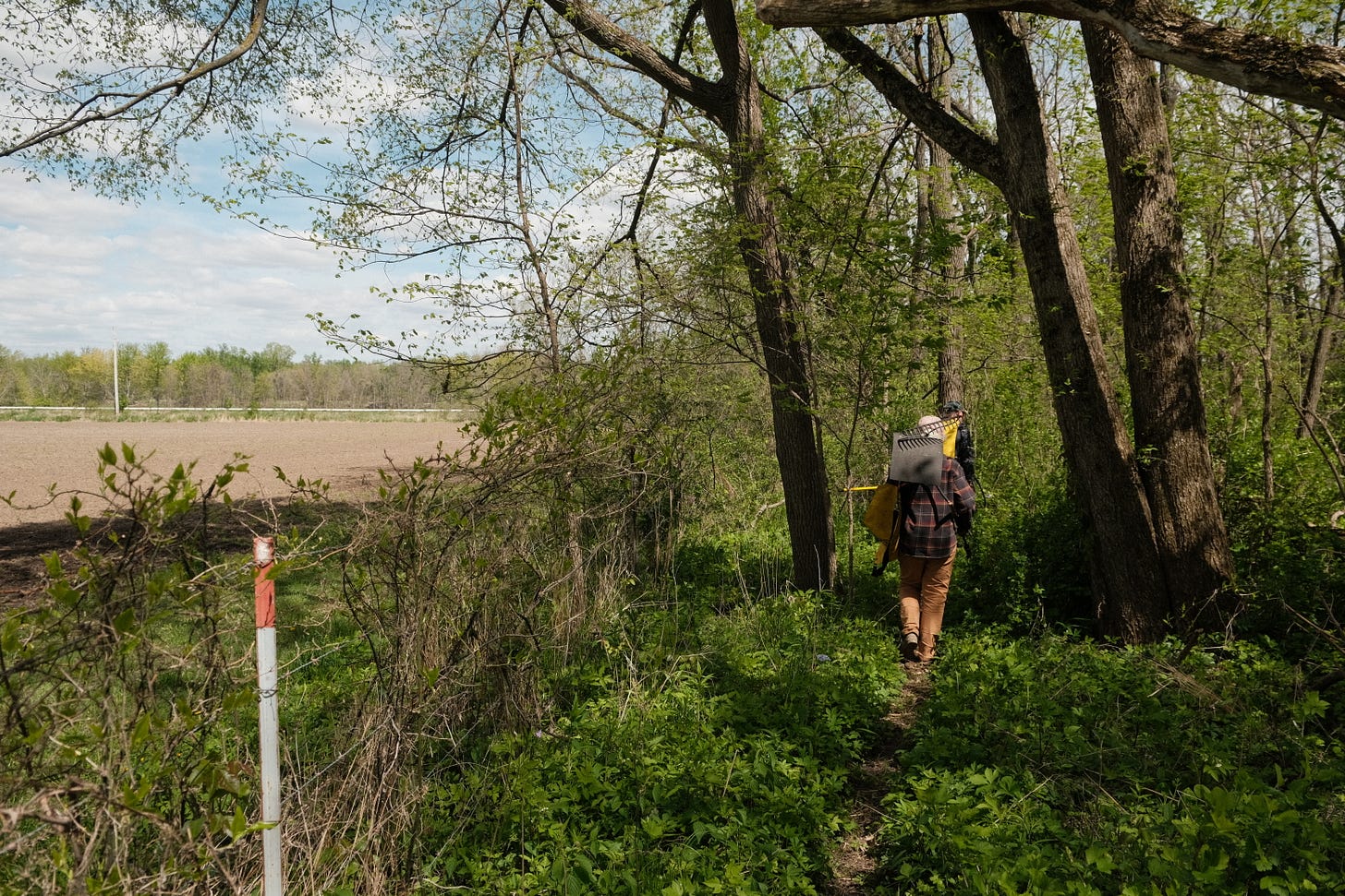In the book, Longmire mentions Diana Horton, a University of Iowa professor who spent her career documenting Rochester Cemetery’s rare prairie plants. But she’d passed away, years before. I cold emailed Irish in the biology department to see if she knew much about Rochester, and it turns out she did—she used the cemetery as a model for this restoration she was attempting just a couple of miles down the road. So after I visited Rochester for a garlic mustard pull earlier that day in May, I drove down to meet Irish and Szymkowiak at their property. By that point, I was also working on a feature for bioGraphic Magazine about herbicide drift—this ongoing ecological crisis in the Midwest where chemicals sprayed on crop fields are drifting onto native ecosystems, killing even the strongest trees. It turned out drift from nearby farms was also decimating the oaks in their restored oak savanna.