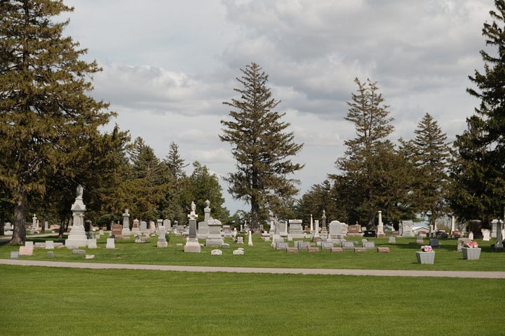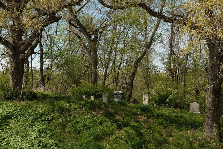 I’d first spoken with Irish in March of last year, just after I’d gotten the assignment to write an essay about prairie remnants on pioneer cemeteries in Iowa for Noema Magazine. I’d gotten the idea for the story from another scientist at the University of Iowa, Silvia Secchi, when I interviewed her that January for an op-ed about carbon sequestration pipelines for ethanol plants in Illinois. At one point in the interview, she pulled out a book called Life and Death on the Prairie by Stephen Longmire, a New York-based landscape photographer, to illustrate a point—prairie used to cover most of the Midwest, and now it’s so rare it only persists in the few places that haven’t ever been plowed, like pioneer cemeteries. I found the book (it’s no longer in print but the University of Iowa has copies) and knew I had to visit the magical place at its center, Rochester Cemetery—a unique oak savanna remnant just 20 minutes or so from my hometown. That led to the Noema essay, and to Irish.